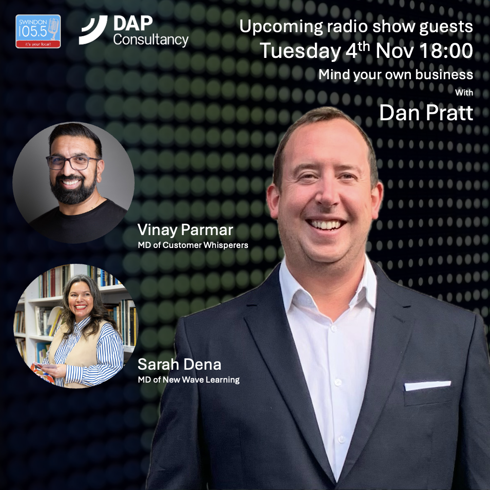Dan Pratt, Founder and Director of DAP Consultancy presents a monthly business radio show on Swindon 105.5, available on FM, DAB, Live Stream and Podcast.